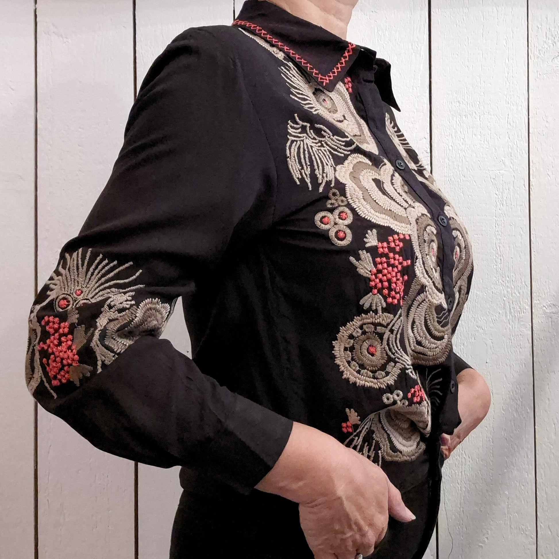 Cette chemise manches longues allie élégance et confort grâce à sa fabrication 100 % viscose, offrant une douceur agréable au toucher. Ses délicates broderies apportent une touche raffinée et unique à votre tenue, idéale pour un style soigné au quotidien. Polyvalente et légère, elle vous accompagne avec confort tout au long de la journée.