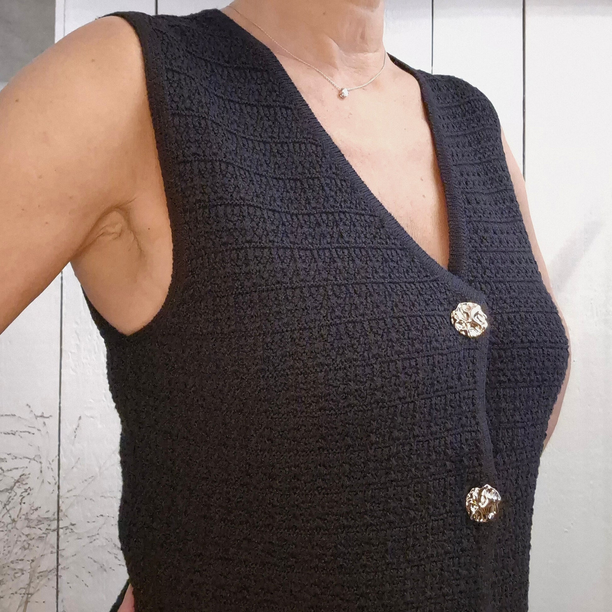 Ce gilet sans manches, agrémenté de boutons dorés élégants, apporte une touche raffinée à votre tenue tout en offrant une liberté de mouvement optimale. Sa coupe ajustée vous accompagne avec confort et style, idéal pour superposer sans alourdir. Parfait pour toutes les occasions où vous souhaitez allier simplicité et sophistication.