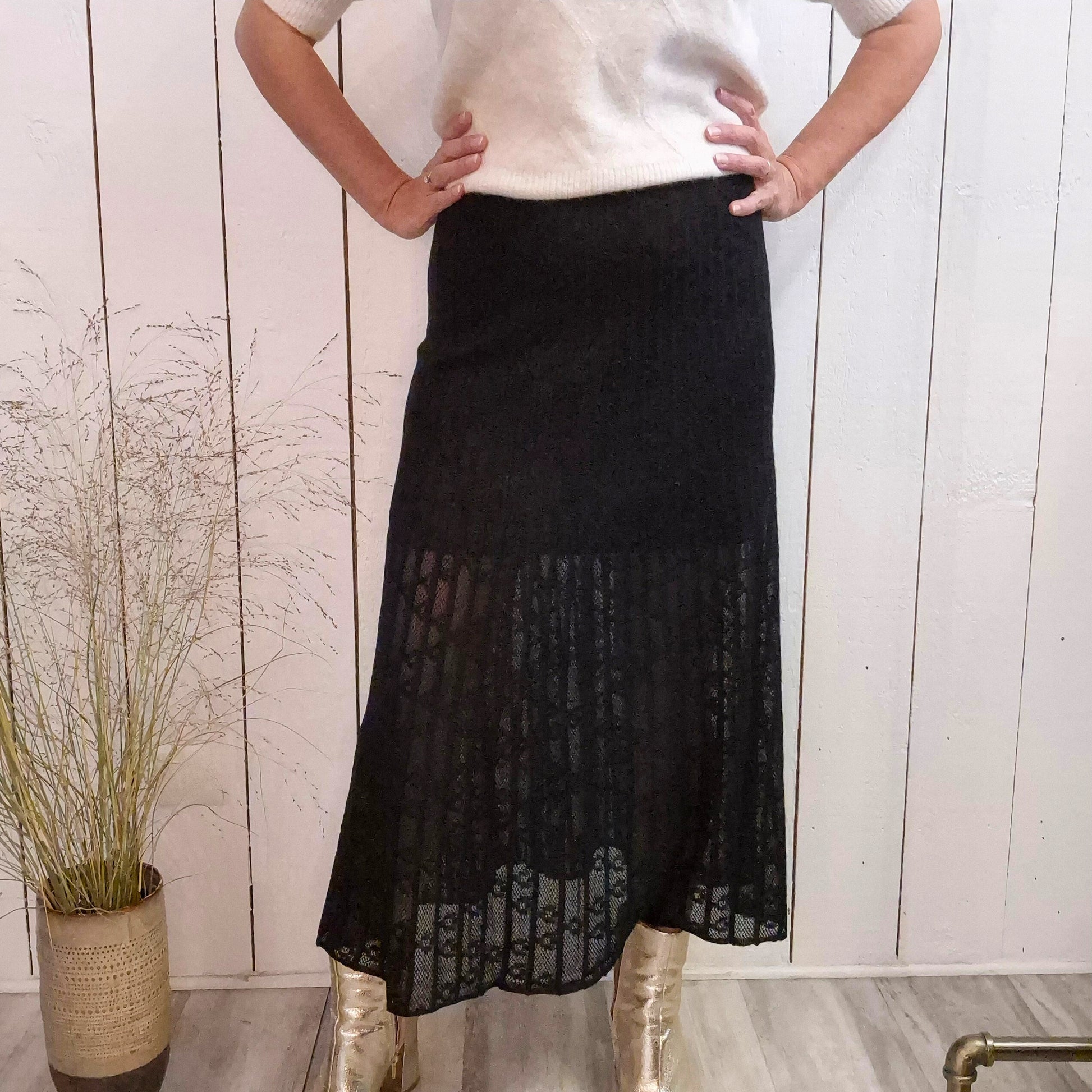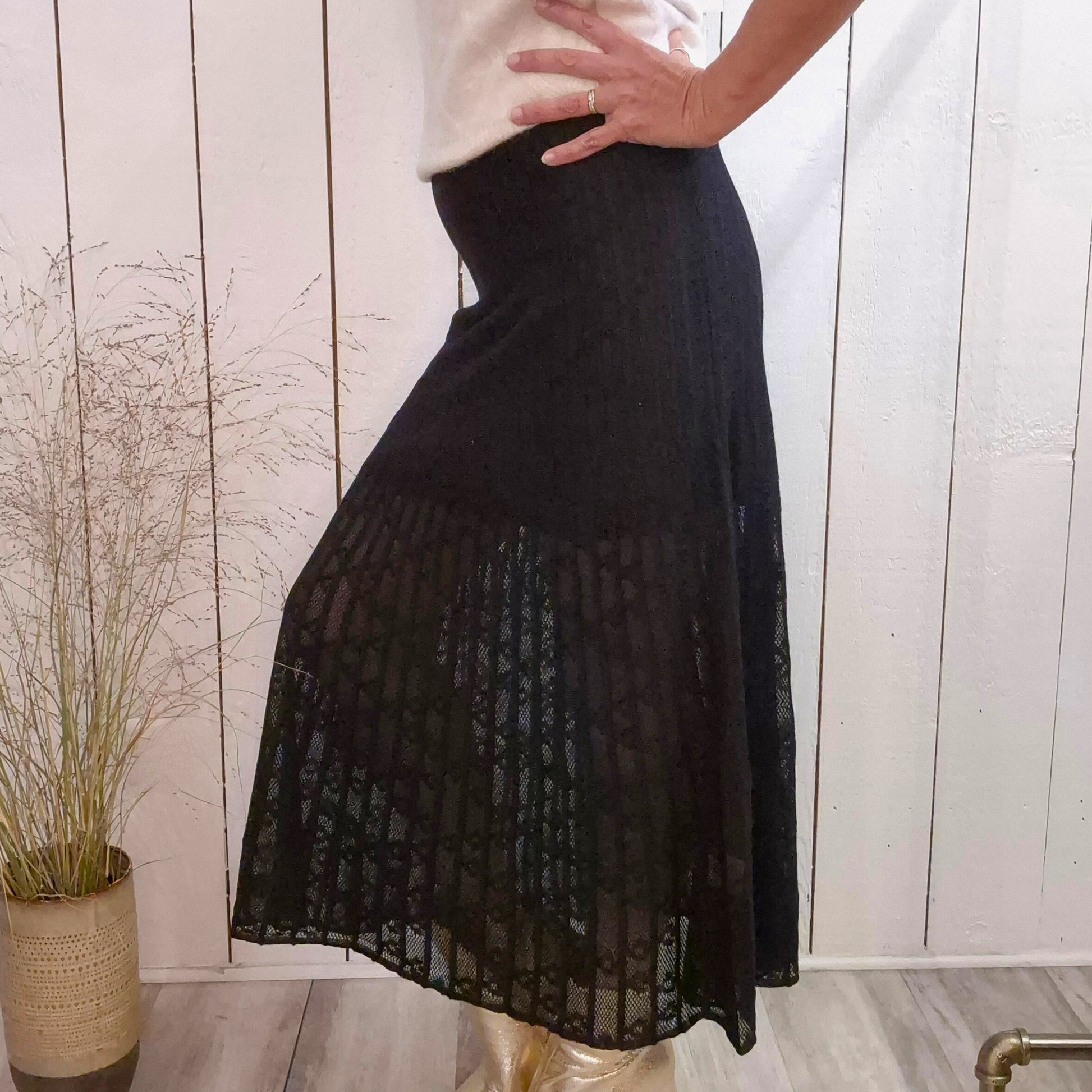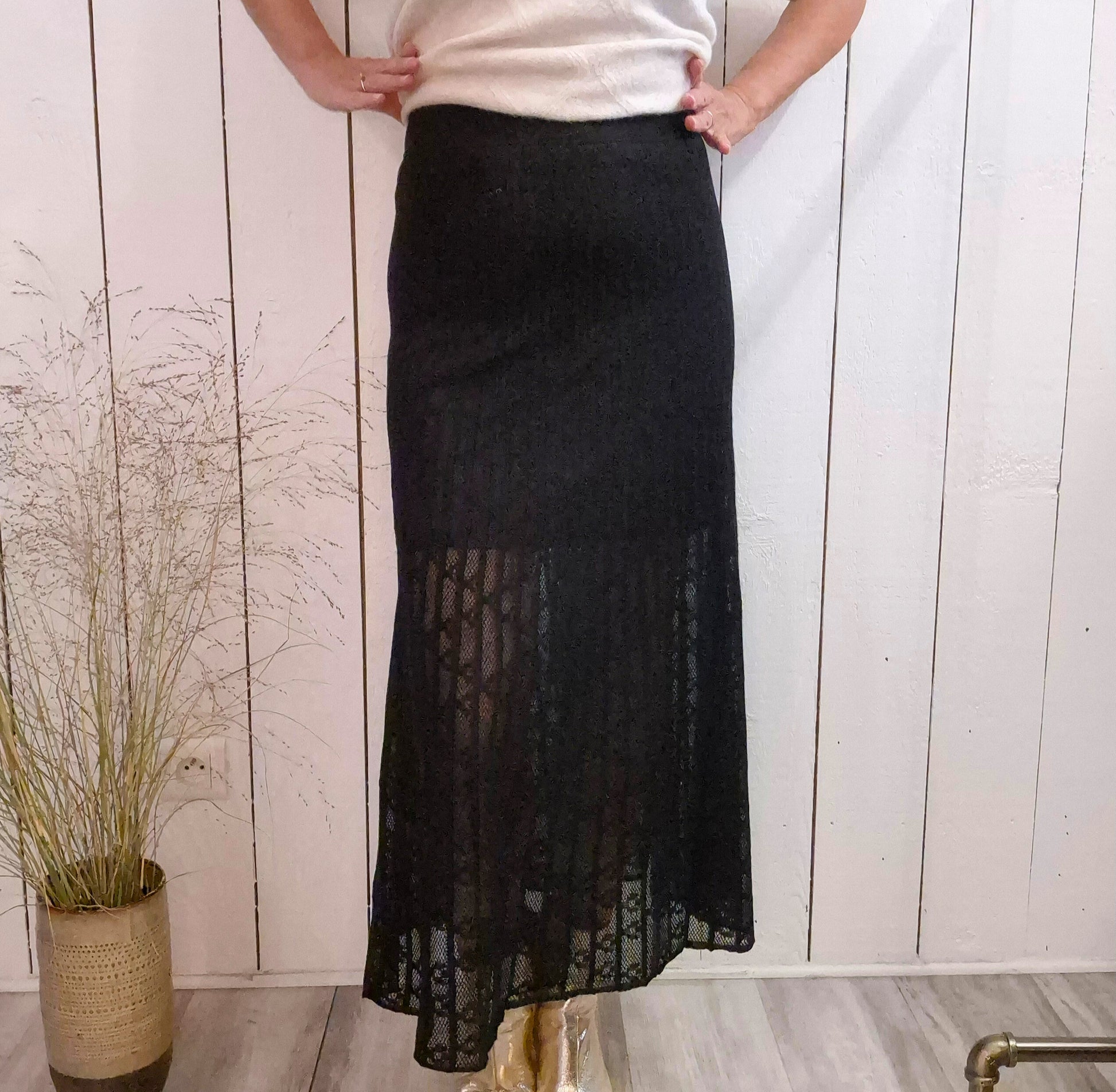Cette jupe longue associe élégance et confort grâce à son effet dentelle transparente délicat et sa ceinture élastique. Avec 6 % de laine, elle offre une agréable chaleur tout en conservant une légèreté idéale pour un port quotidien. Parfaite pour sublimer vos tenues tout en restant à l’aise en toute saison.