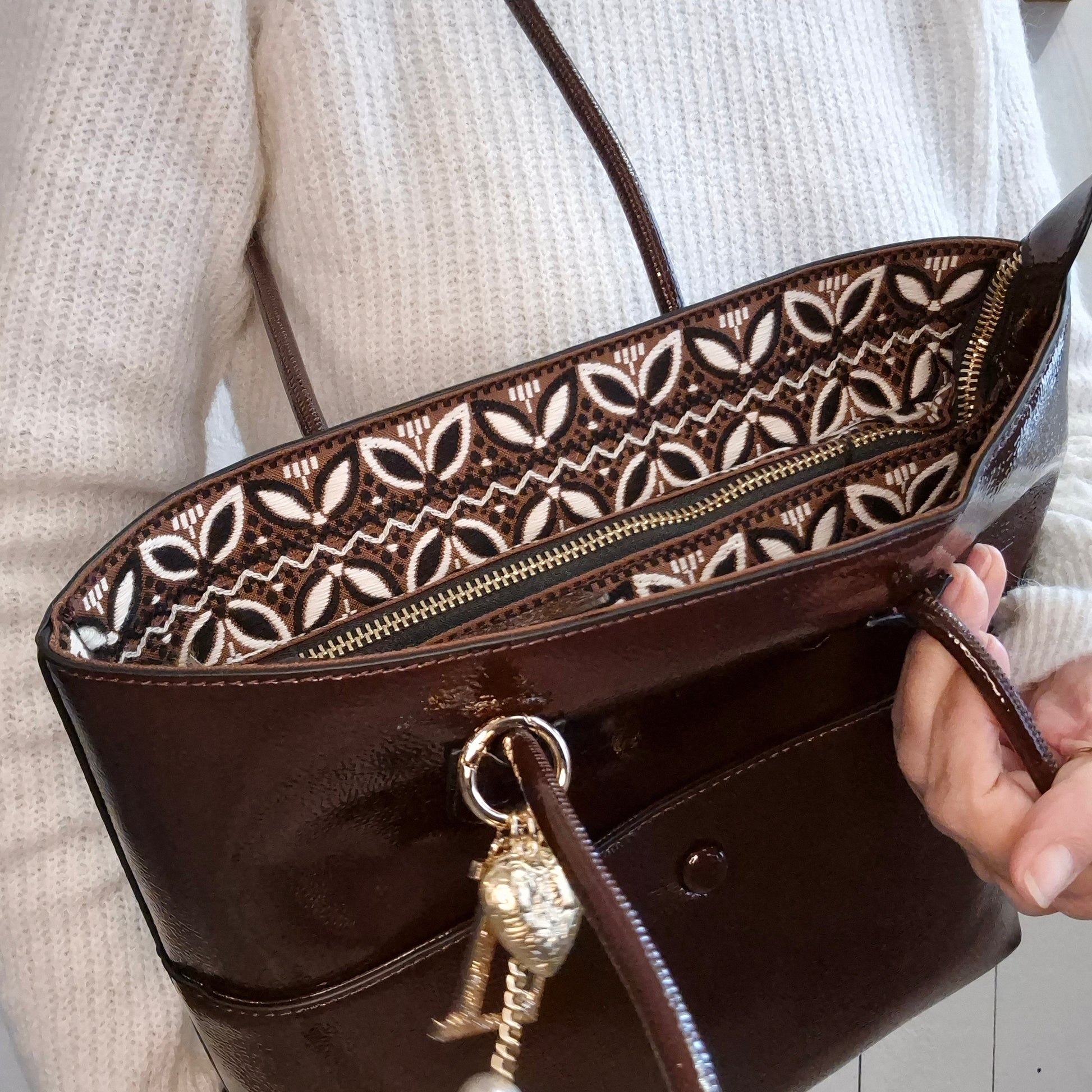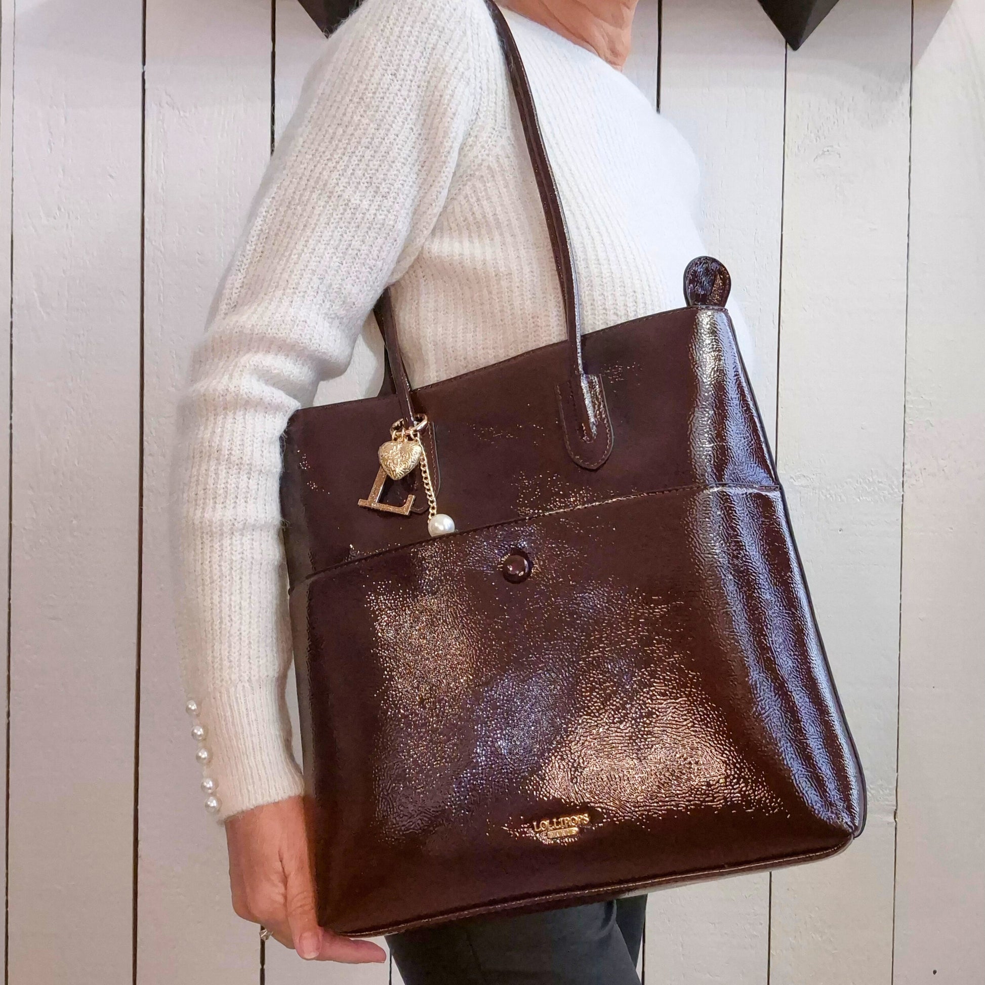 Ce grand sac à main en simili cuir grainé vernis allie élégance et praticité. Ses deux anses solides facilitent le transport, tandis que sa finition vernie lui apporte une touche raffinée. Idéal pour accompagner votre quotidien avec style et confort.