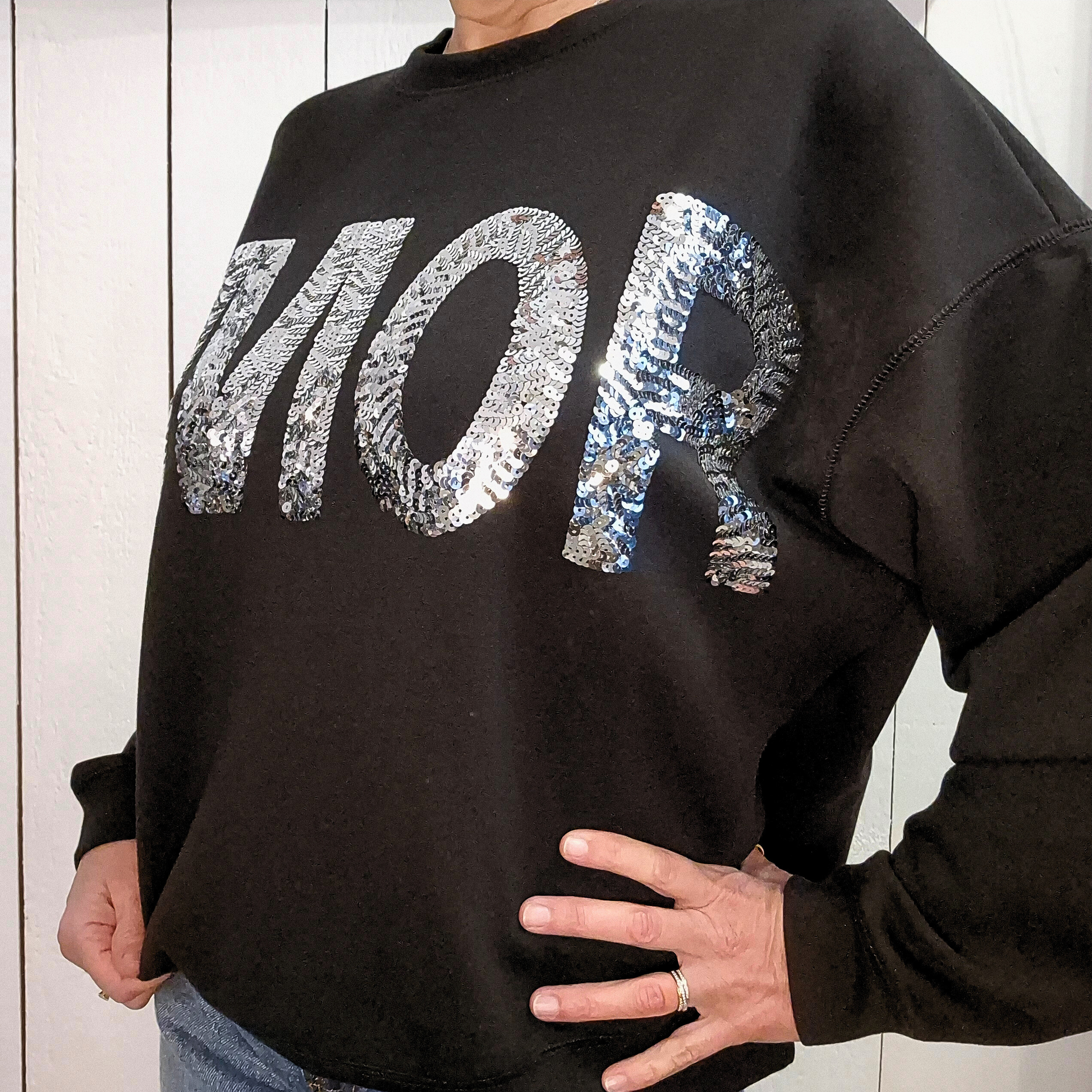 Ce sweat large offre un confort absolu grâce à sa coupe ample, parfaite pour se sentir à l’aise toute la journée. Son design élégant est sublimé par l’écriture « AMOR » en sequins argentés, apportant une touche de brillance et de modernité. Idéal pour un look décontracté mais soigné, ce sweat allie douceur et style avec finesse.